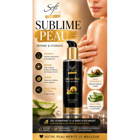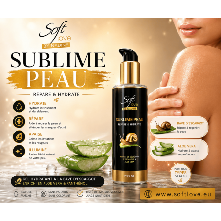 Sublime Peau est un soin hydratant intensif qui respecte la peau sensible et révèle l'éclat naturel de l'épiderme. Ce gel douceur offre une formule unique enrichie en bave d'escargot, aloe vera et glycérine végétale. Il hydrate, répare et apaise toutes les peaux, même les plus délicates.