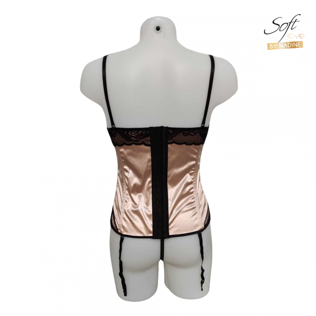 Ce bustier satiné beige et dentelle noire sublime votre silhouette avec élégance. Ajustable et raffiné, il allie confort et style.