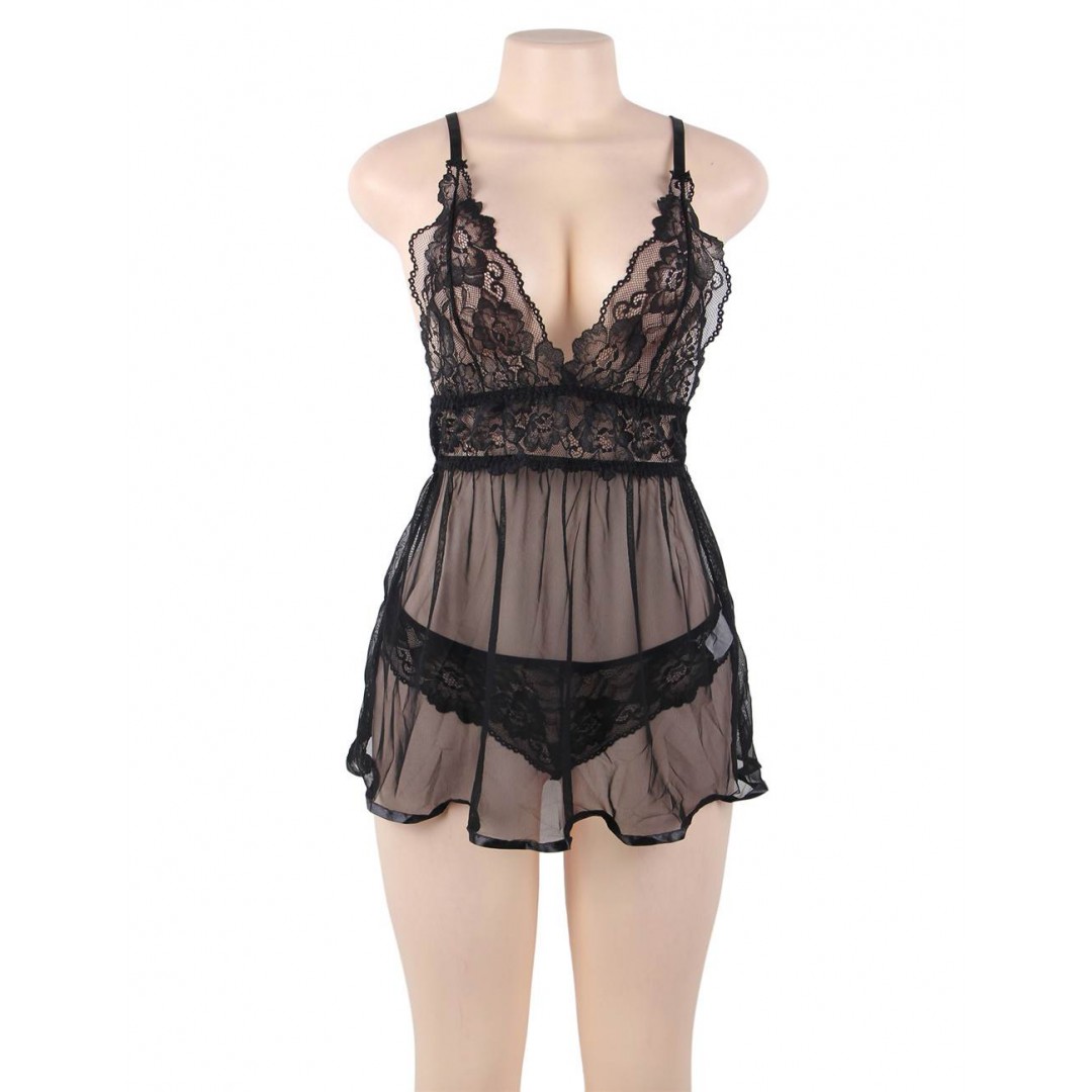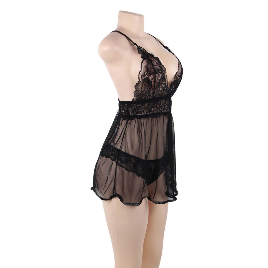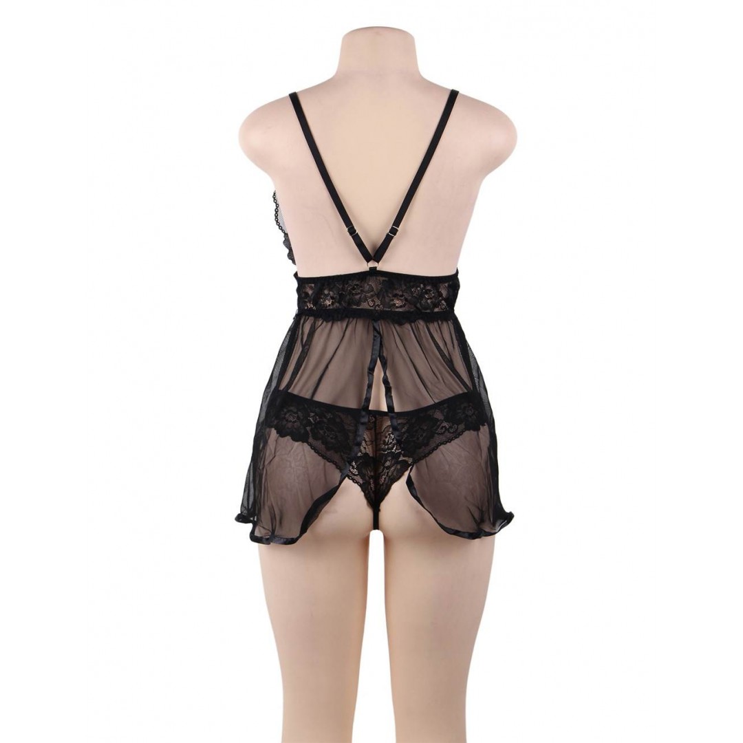 Cette nuisette en dentelle noire allie élégance et sensualité. Avec son décolleté plongeant, voile transparent et dos ouvert, elle sublime vos courbes. Inclut une culotte assortie pour compléter le look. Bretelles ajustables et tissus légers garantissent confort et séduction. Idéale pour des occasions spéciales ou des soirées romantiques.