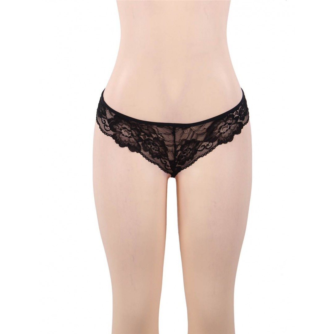 Le dos présente une coupe en fourche ouverte, ajoutant une touche coquine tout en restant chic. Les bretelles réglables offrent un ajustement parfait, garantissant confort et maintien. L’ensemble est complété par une culotte assortie en dentelle, apportant une finition harmonieuse à cette tenue.