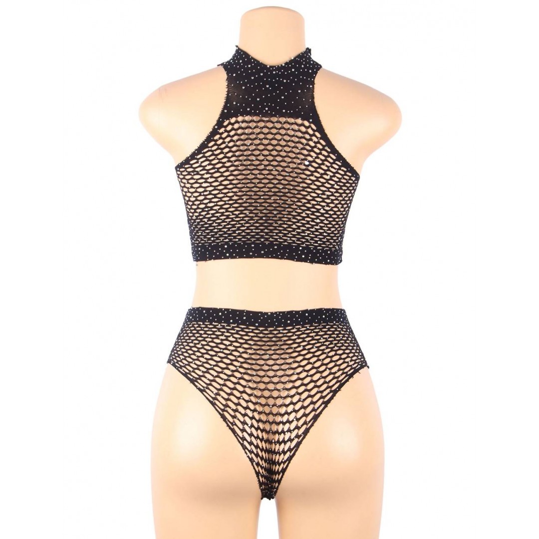 Ensemble deux pièces en résille strass transparent. Haut col montant, bas taille haute. Tissu stretch. Strass brillants. Coupe sexy. Confortable. Parfait pour look intime ou audacieux. Trois tailles disponibles. Lingerie tendance. Glamour assuré.