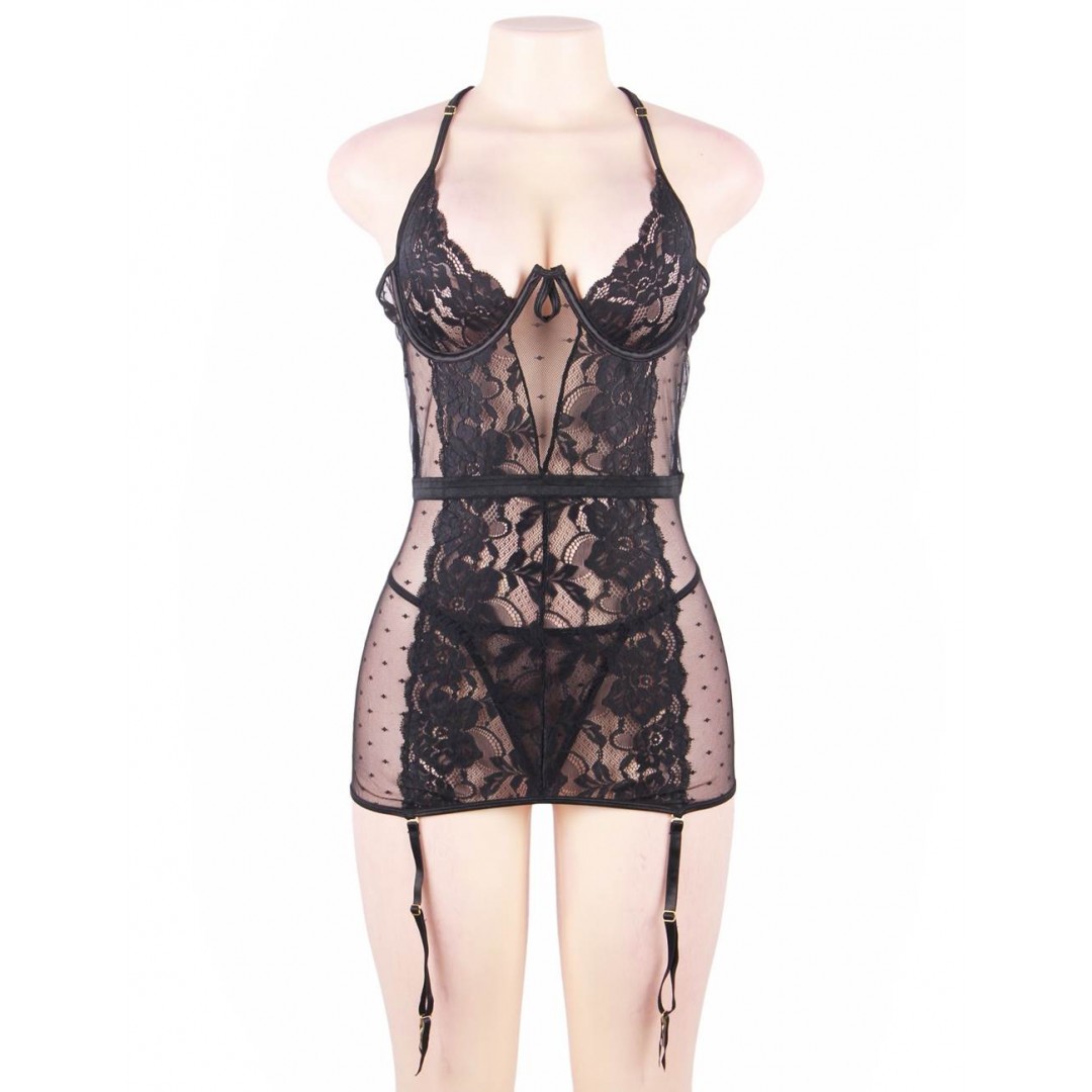 Succombez à l’élégance de cette nuisette noire en dentelle délicate avec armatures et jarretelles intégrés.