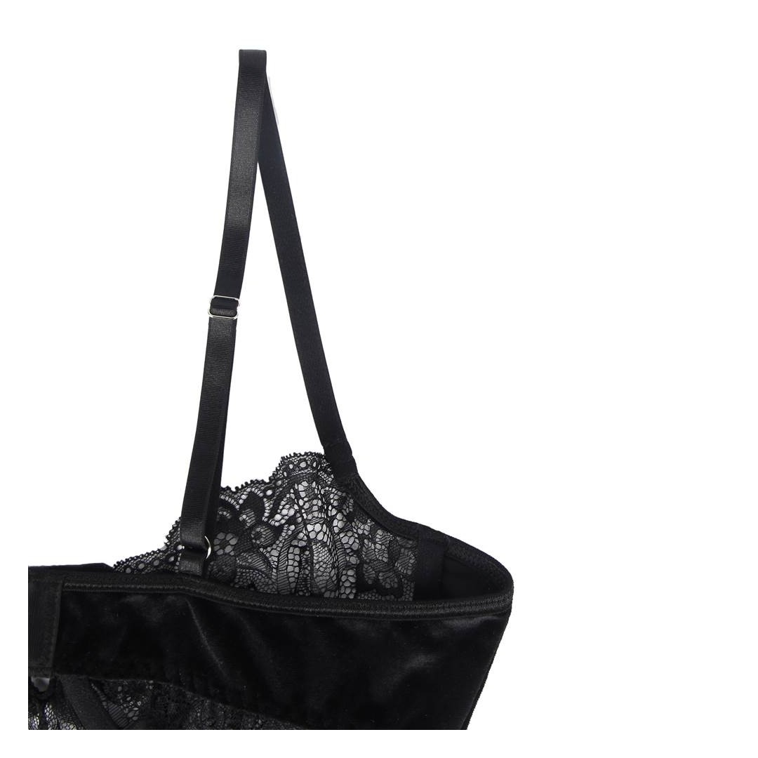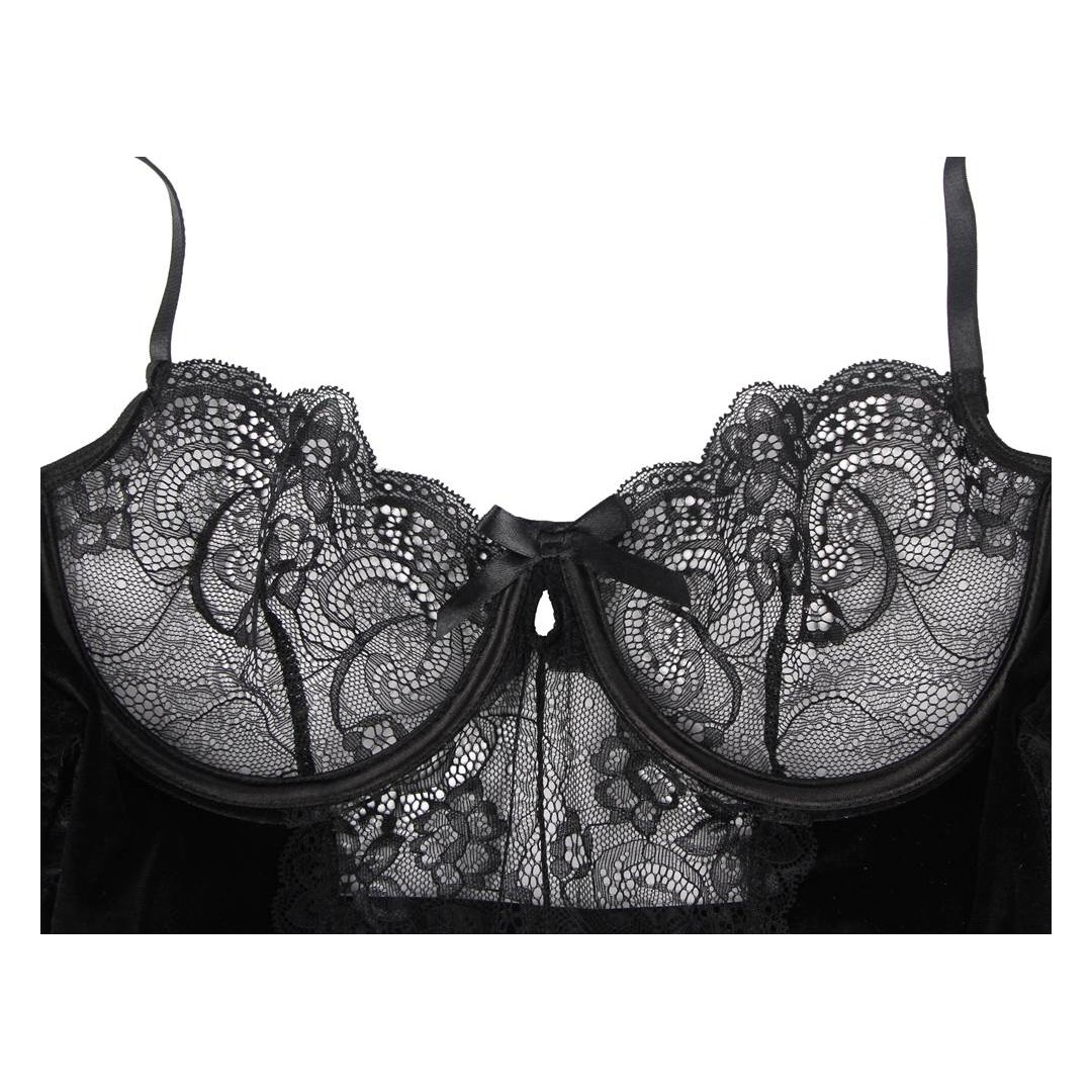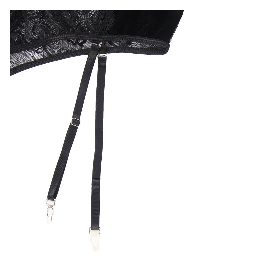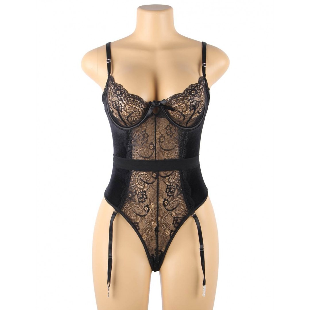 Body noir en velours avec armatures et jarretelles réglables. Dentelle florale, dos croisé, coupe flatteuse, confort absolu. Élégant, sexy, raffiné. Idéal pour séduire ou sublimer.