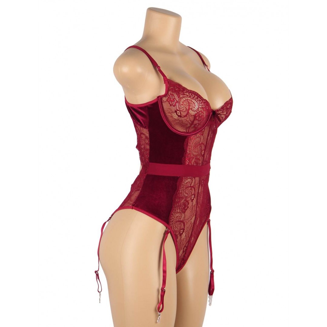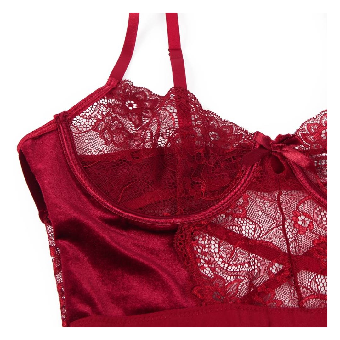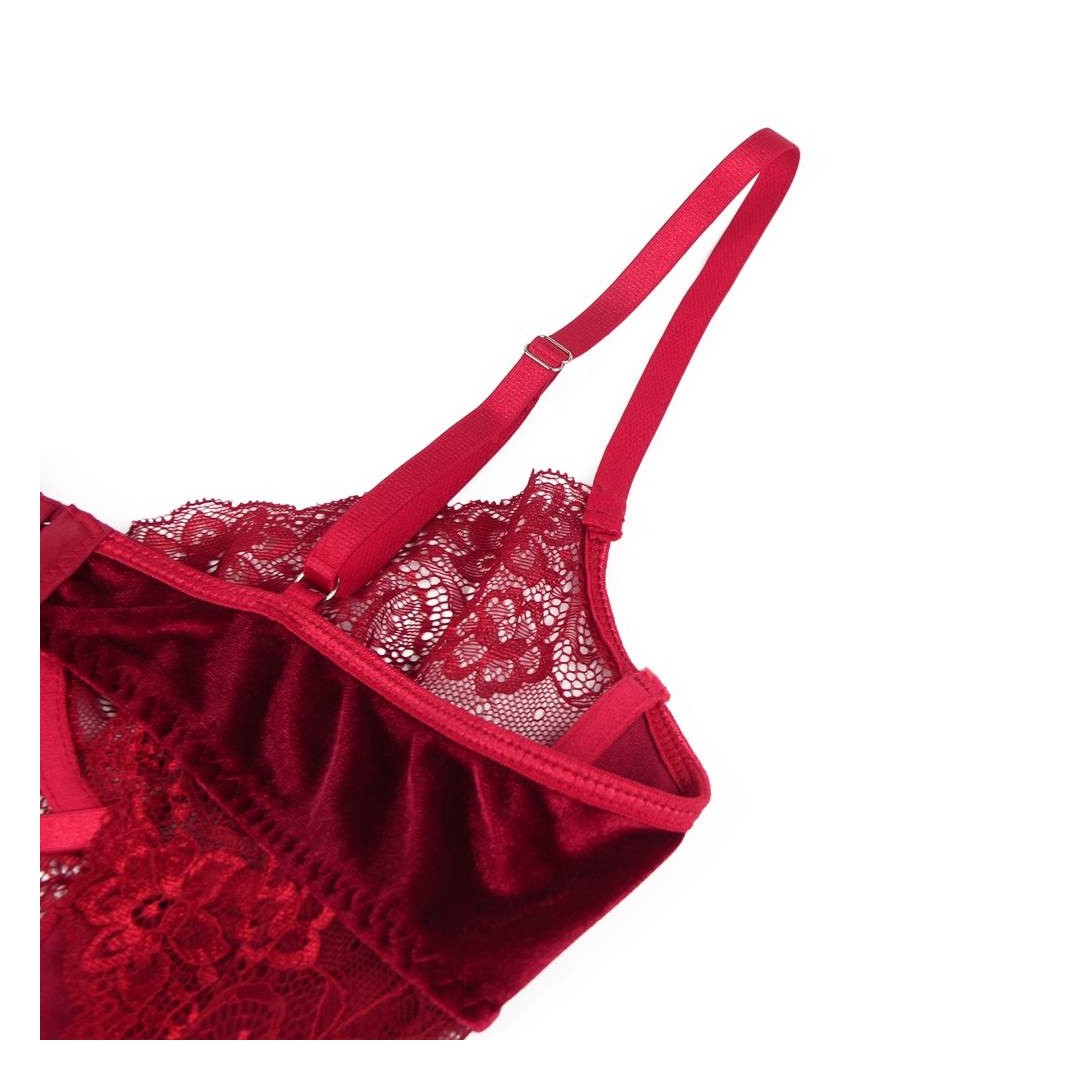 Body noir en velours avec armatures et jarretelles réglables. Dentelle florale, dos croisé, coupe flatteuse, confort absolu. Élégant, sexy, raffiné. Idéal pour séduire ou sublimer.