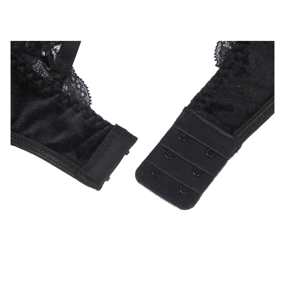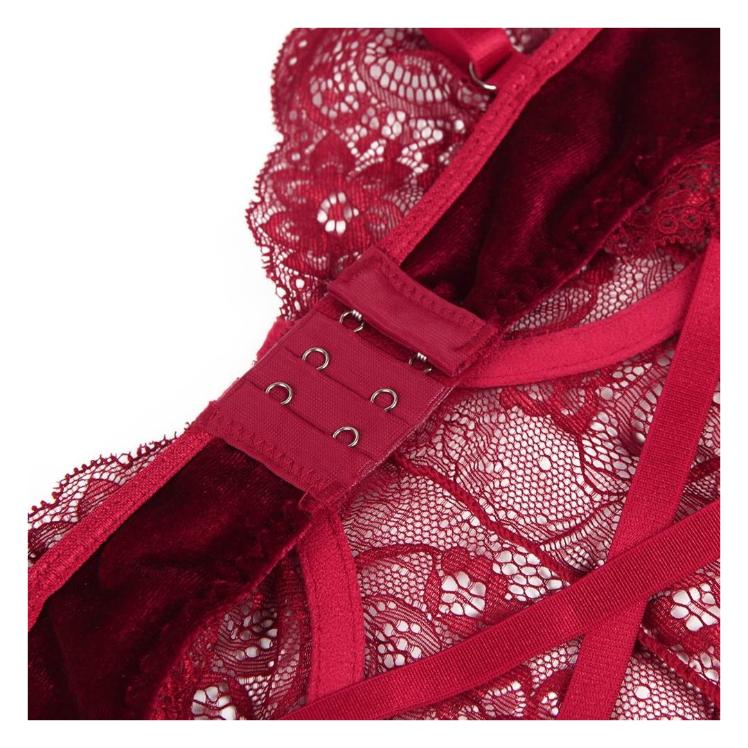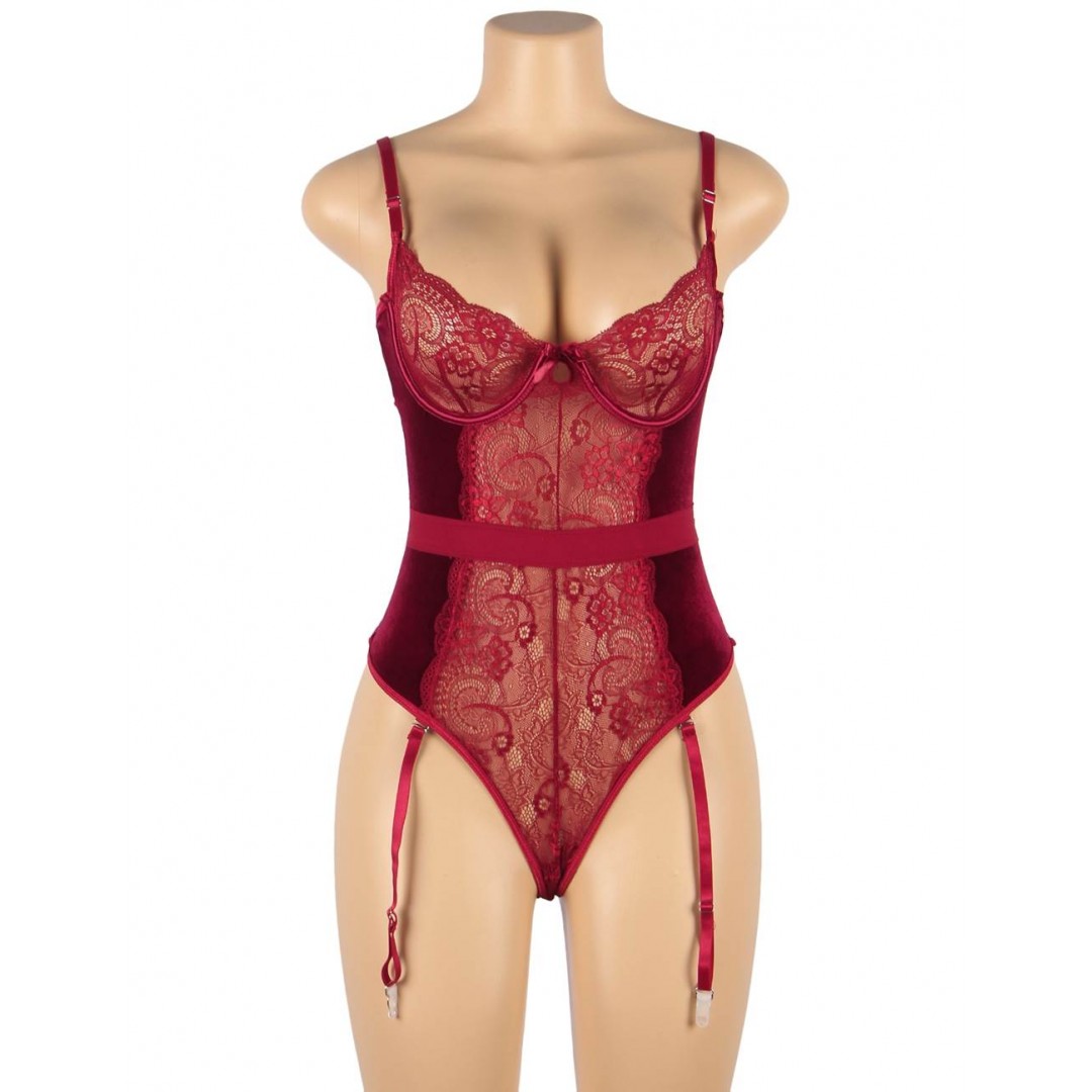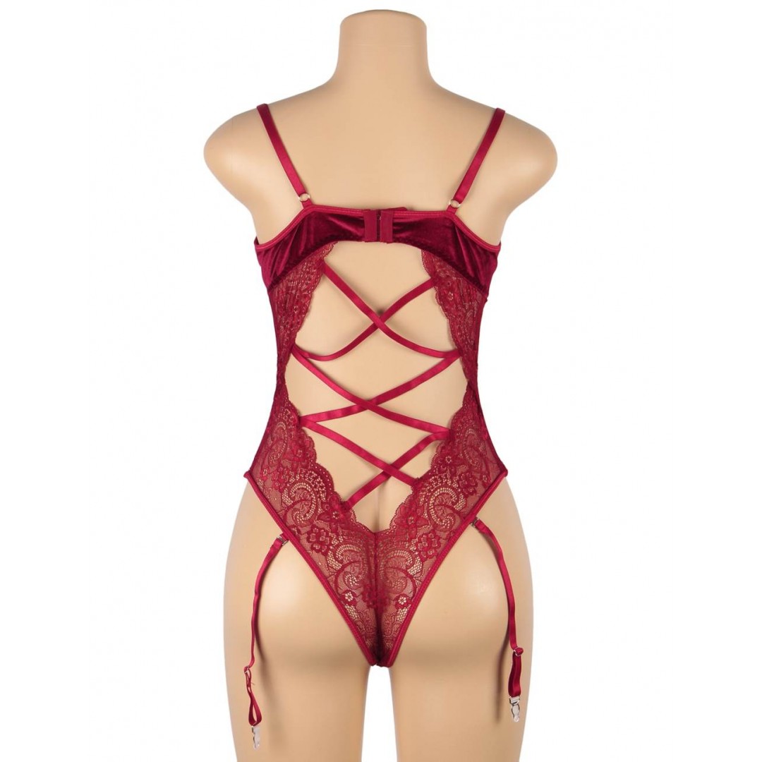 Body noir en velours avec armatures et jarretelles réglables. Dentelle florale, dos croisé, coupe flatteuse, confort absolu. Élégant, sexy, raffiné. Idéal pour séduire ou sublimer.