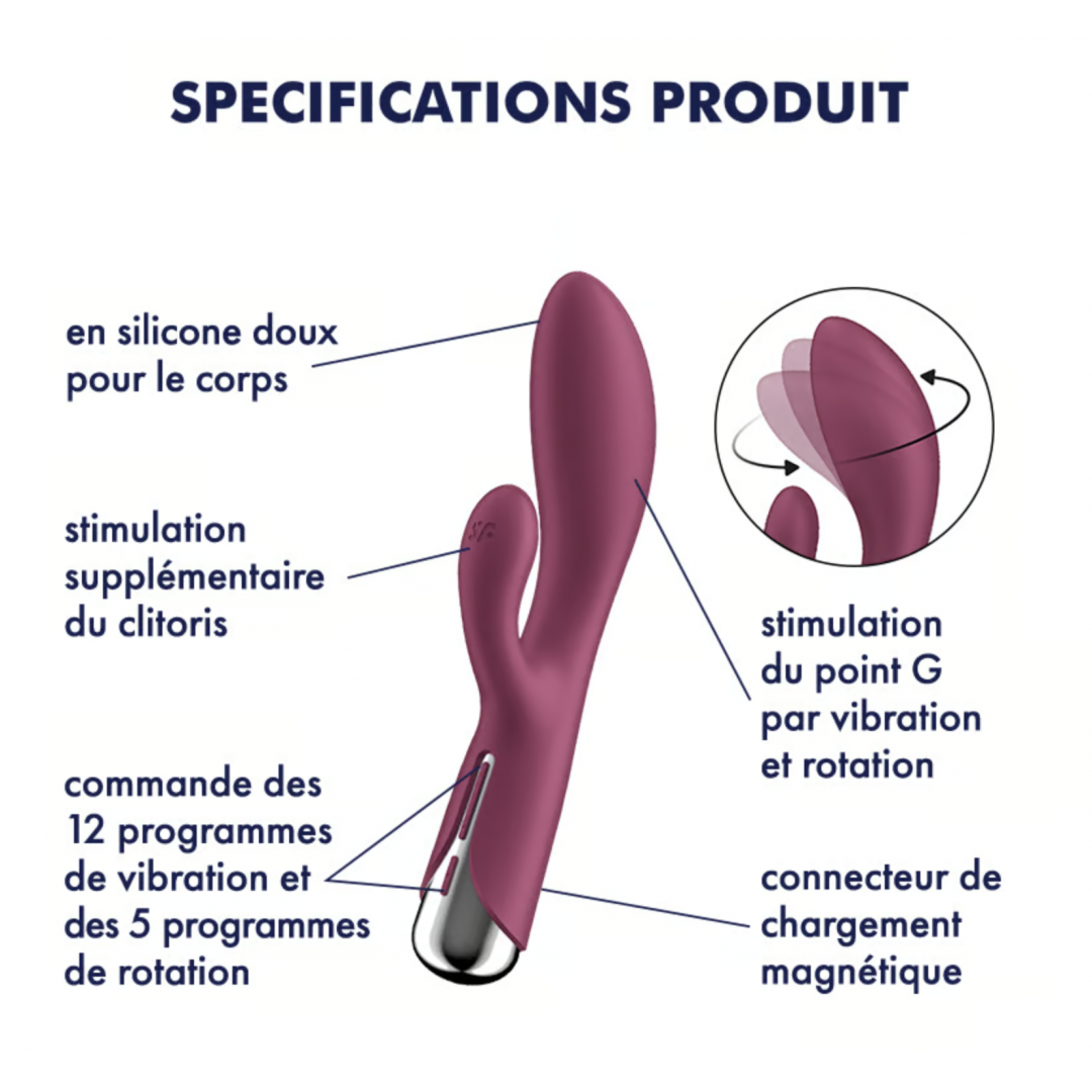 Vous allez adorer ce type de rotation : le Satisfyer Spinning Rabbit 1 est un vibromasseur Rabbit sur le clitoris et votre point G avec des vibrations et des rotations d’un tout nouveau type. Préparez-vous pour une nouvelle combinaison voluptueuse !