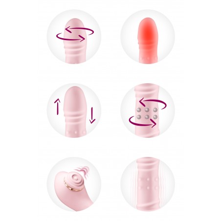 Le vibromasseur rabbit 6-en-1 combine chaleur, rotation 360°, va-et-vient, billes rotatives, tapping clitoridien et vibrations.