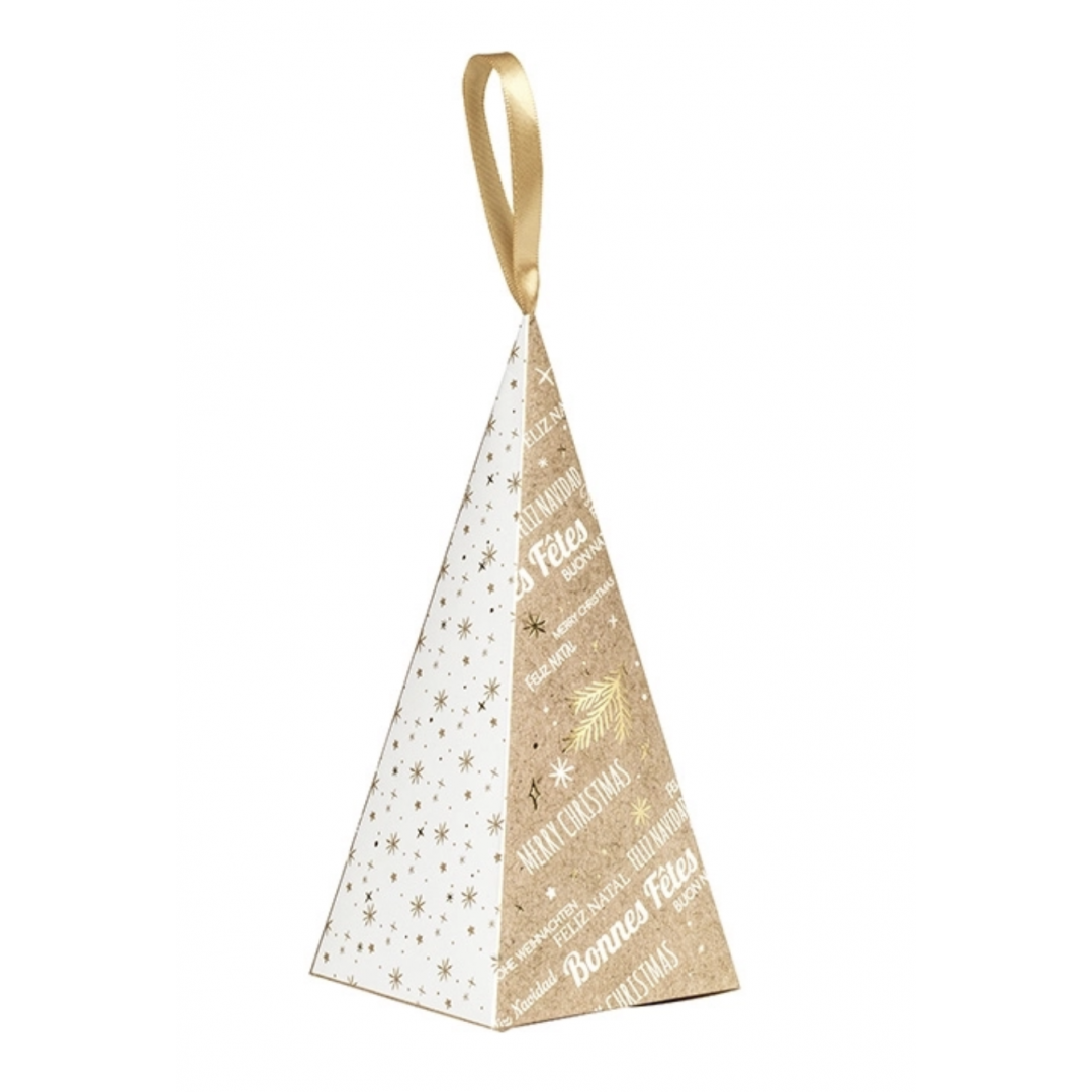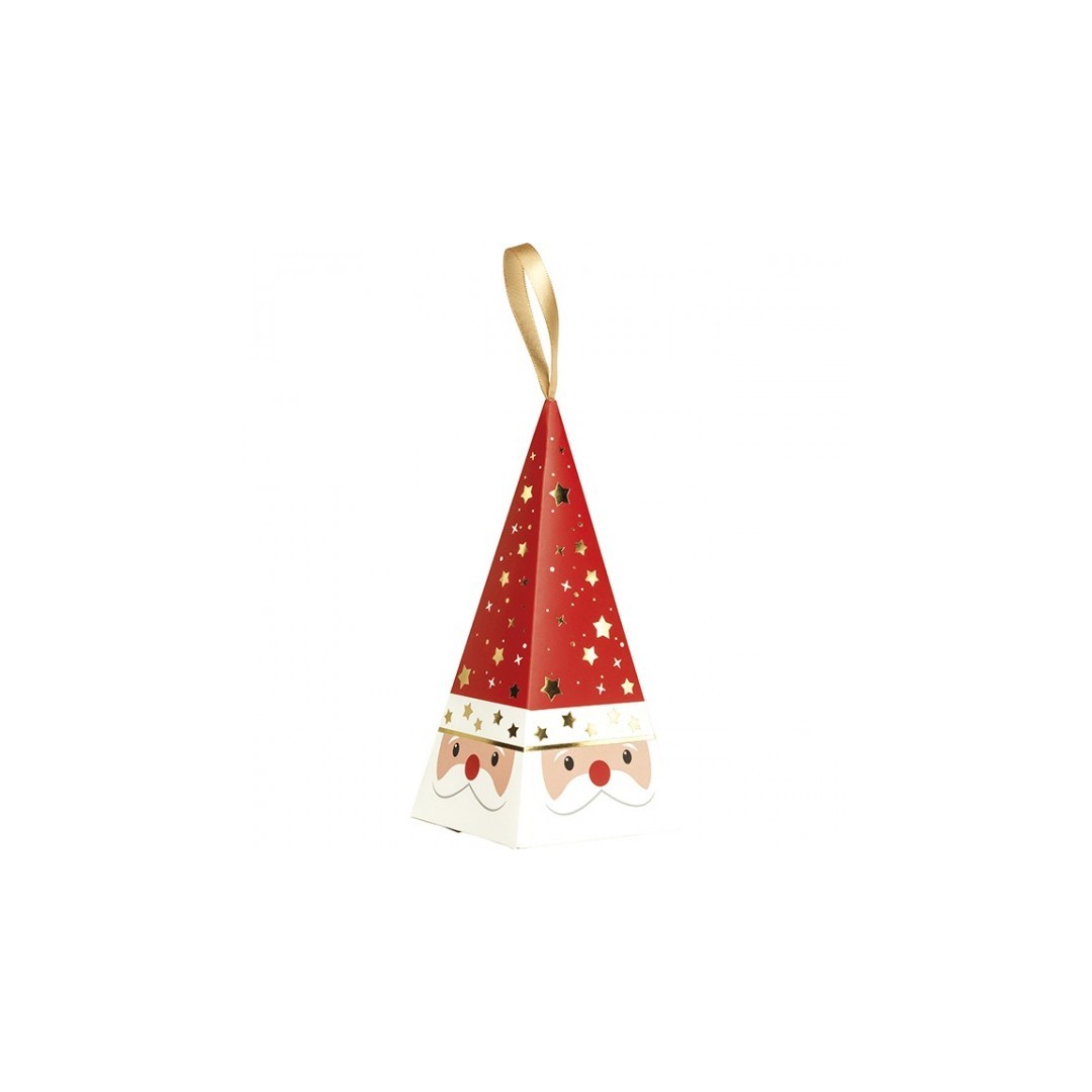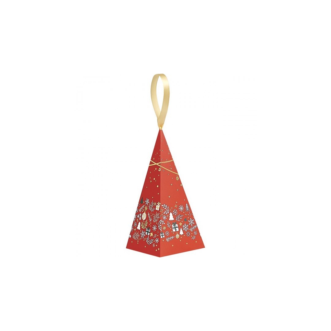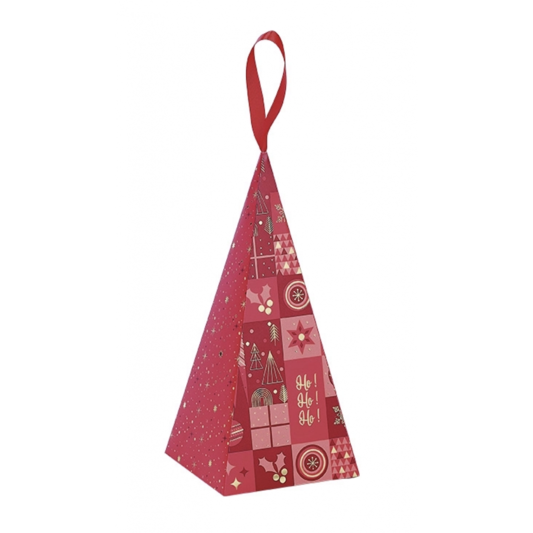 Pyramide papier décor Bonnes Fêtes rouge/blanc/dorure or ruban satin.