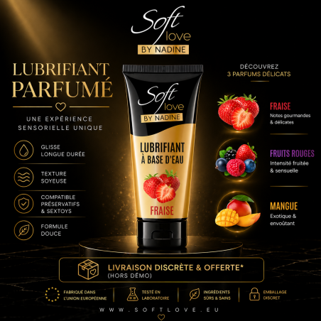 Le lubrifiant à base d'eau parfumé 100ml Soft Love est un produit spécialement conçu pour sublimer vos moments intimes. Enrichi de parfums délicats, il combine plaisir olfactif et confort pour vous offrir une expérience unique. Ce lubrifiant haut de gamme s’intègre parfaitement à la collection Soft Love, répondant aux besoins des clients exigeants à la recherche de qualité et d’innovation.