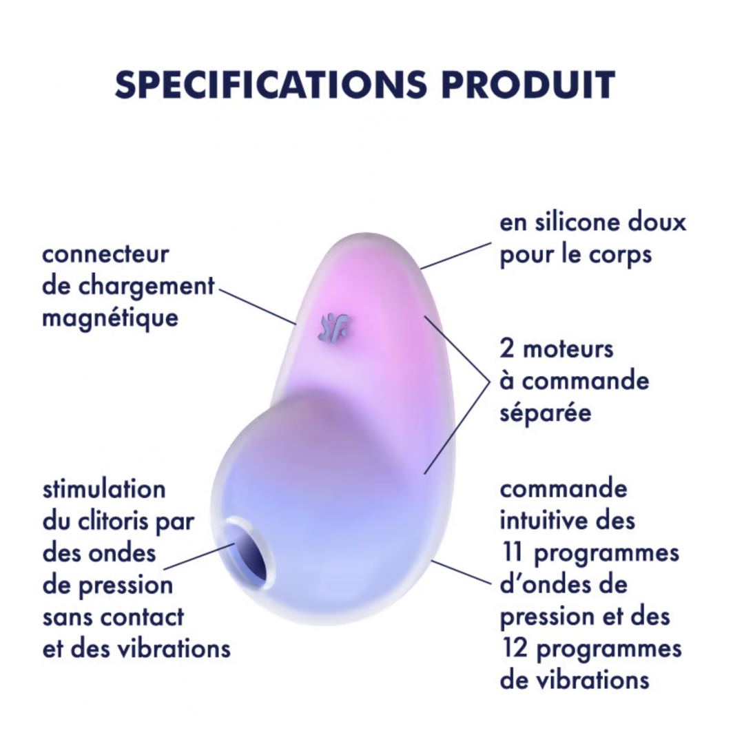 Avec le Satisfyer Pixie Dust, vous profiterez d’une stimulation clitoridienne magique : grâce à la technologie innovante Air Pulse, appréciée dans le monde entier, ce vibromasseur à poser stimule votre clitoris sans le toucher, vous offrant des orgasmes incomparables. Placez l’ouverture sur votre clitoris et découvrez la véritable magie en choisissant celui qui vous convient le mieux parmi les 11 programmes d’ondes de pression d’intensités différentes. Mais le Satisfyer Pixie Dust peut faire encore mieux et vous propose 12 programmes de vibrations supplémentaires, dont vous pouvez profiter séparément ou en les combinant avec les ondes de pression, grâce à ses deux moteurs pouvant être commandés ensemble ou séparément. La surface du Satisfyer Pixie Dust est en silicone souple incroyablement doux pour votre peau. Avec son dégradé de couleurs et sa couche de silicone transparente, ce jouet est également très esthétique.