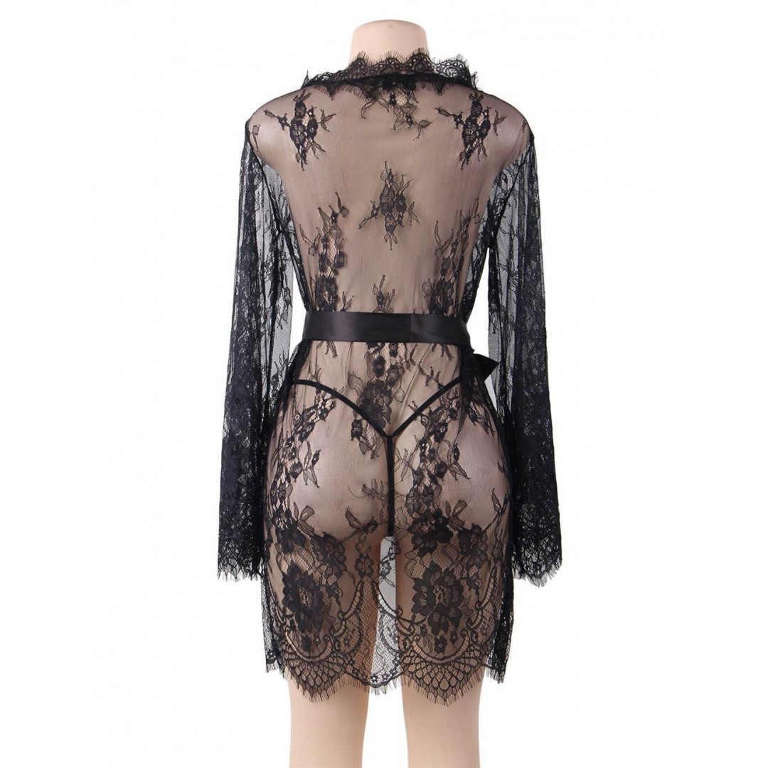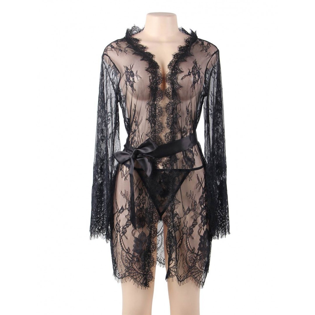 La coupe du modèle noir valorise les formes sans les comprimer. Les manches longues en dentelle ajoutent du caractère, tandis que l’ourlet festonné renforce le côté luxueux. Ce peignoir de nuit noir transparent peut être porté seul ou avec une parure de lingerie noire pour un effet coordonné irrésistible.