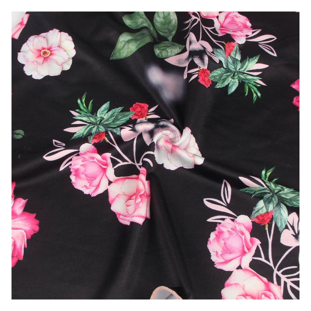 Ce modèle séduit par son imprimé fleuri vif et romantique, posé sur un tissu noir satiné doux.