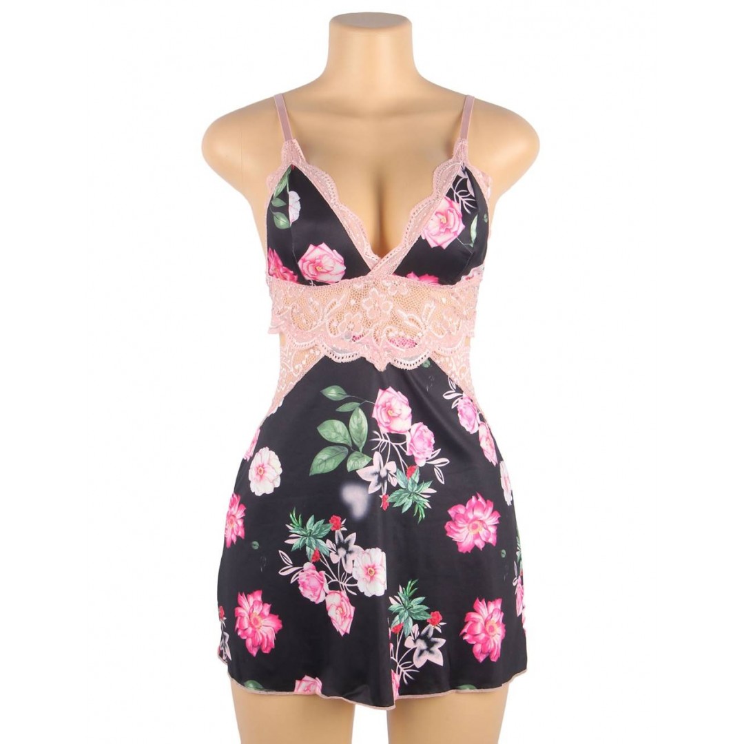 Nuisette fleurie sans armatures, en satin doux et dentelle rose. Dos ajouré, coupe fluide, confort absolu. Élégante, romantique et agréable à porter.