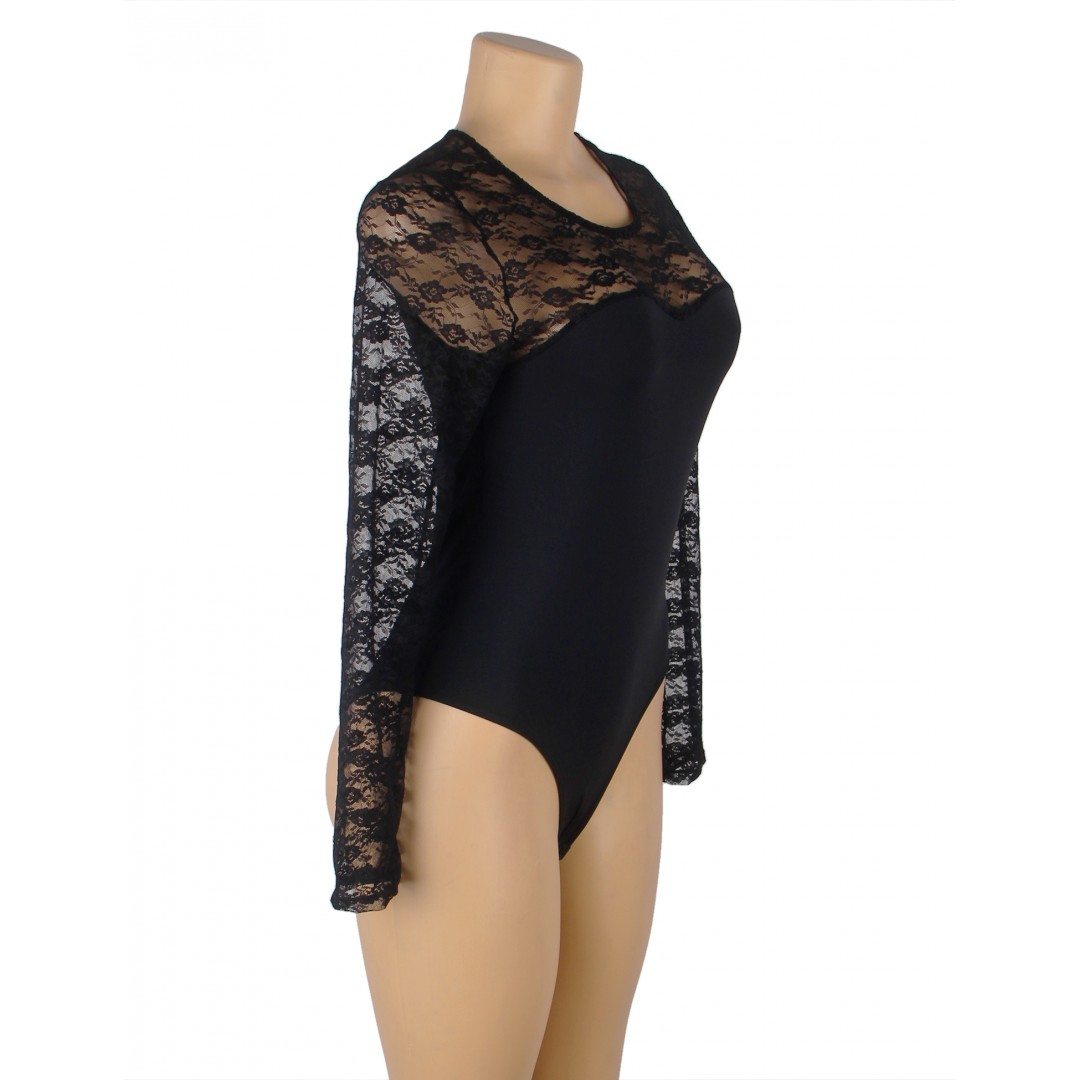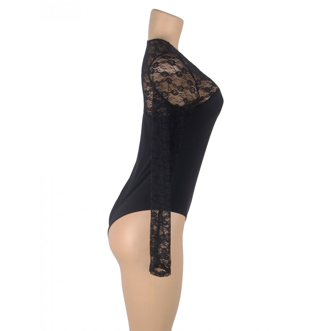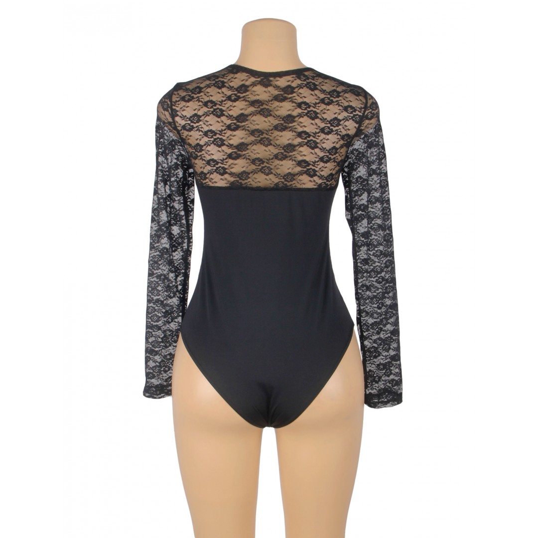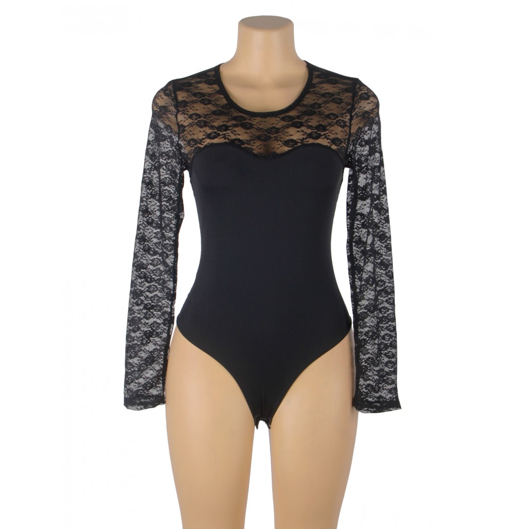 La dentelle raffinée recouvre les bras et le haut du décolleté, créant un jeu subtil de transparence. Ce body à manches longues en dentelle noire offre un mélange parfait entre romantisme et audace. La partie centrale opaque en forme de coeur structure la silhouette et dessine les courbes avec finesse.